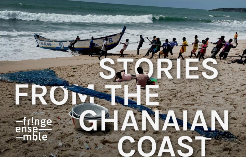 Das fringe ensemble hat zunächst in Cape Coast mit einem Ensemble aus ghanaischen Schauspieler:innen, Musiker:innen und lokalen Fischern das Stück „Listen to the Fischers“ entwickelt. Die gesammelten Geschichten, die Songs der Fischer und die Videos, die Annika Ley gedreht hat, bilden die Grundlage für die Lecture-Performance in Bonn, die Frank Heuel mit einem deutsch-ghanaischen Schauspiel-Ensemble und einem ghanaischen Musiker inszeniert hat.